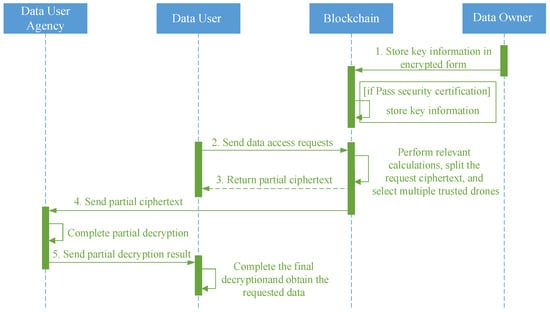 As can be seen from Figure 4, when a data user requests vital data from the blockchain, the blockchain parses the requested ciphertext data and selects several reliable drones as data user agents, which assist the data user to complete partial decryption and improve the decryption efficiency of the data user. The details of each module are shown below.