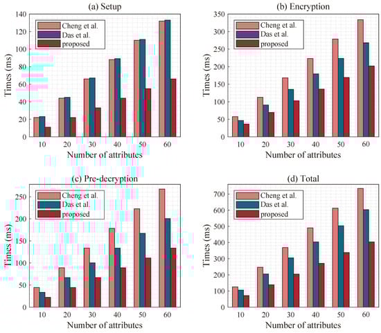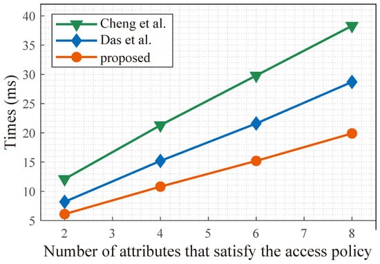 Similarly, the computation cost of the proposed scheme and the existing scheme in the pre-decryption aspect is compared by increasing the number of attributes. The details are shown in Figure 7.
