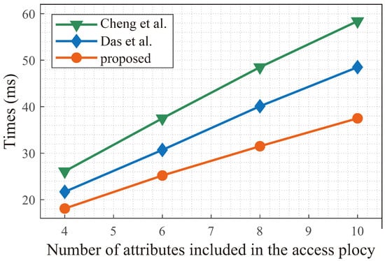 As can be seen from Figure 6, when the number of attributes is the same, the encryption time of the proposed scheme is shorter, and its growth trend is slower as the number of attributes increases.