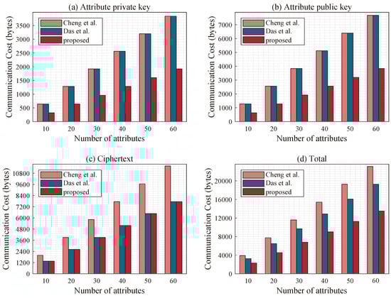 As can be seen from Figure 8, the communication cost of all schemes increases with the increase in attributes. It can be seen from Figure 8a,b that, under the same conditions, the scheme proposed has lower communication cost than other schemes in terms of both attribute private key and attribute public key. As can be seen from the Figure 8c in terms of ciphertext, the communication cost of the scheme proposed is the same as that in [41], and both are lower than that in [39]. It can be seen from the Figure 8d that the total communication cost of the proposed scheme is much lower than that of the existing scheme.
