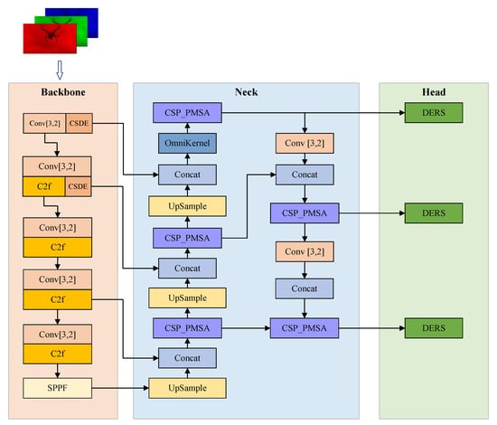 The ATA-YOLOv8 detection network proposed in this paper is improved based on the YOLOv8n model, which improves the original model’s backbone, neck and head, respectively. In the YOLOv8 network, the feature inputs are divided into five classes of scale features by the backbone (B1-B5), feature pyramid networks [15] (P2-P5) and path aggregation network [16] (N2-N4), respectively. For the backbone network, a CSDE (cross stage detail enhance block) module is designed to preserve the small target features while downsampling to obtain features enriched with small target information (B1-P2 and B2-P3). For the neck network, this paper proposes a feature fusion module CSP_PMSA (cross-stage-partial_partial multi-scale feature aggregation), which adopts the efficient PartialConv idea to extract the multi-scale feature information from the input and improve the computational efficiency. New multi-scale information is introduced, which improves the expressive ability of the model. Meanwhile, OmniKernel is designed to fuse the features from layers B1 and B2 of the backbone network and P2 and P3 of the neck network, respectively. This feature fusion module contains a global branch, large branch and local branch, which can effectively learn the feature representations from global to local and, thus, ultimately improve the detection performance of small targets. For the head network, the P2 detection layer for small targets is added, the P5 layer is deleted, and we use the idea of shared convolution to design the DERS (detail enhanced rep shared convolutional detection head). The DERS uses reparameterized convolution so that the network can extract features from the images more efficiently, and the reparameterized convolution can greatly improve the parameter utilization, allowing the detection head to achieve a smaller number of parameters and less computation, improving the detection head’s ability to capture details and reducing the loss of accuracy. In order to solve the problem of inconsistency in the scale of the target detected by each detection head, the features are scaled using the scale layer. The overall structure of the network is shown in Figure 1. The ATA-YOLOv8 model significantly improves the computational efficiency while maintaining high detection accuracy through innovative network design.