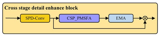 In order to solve the problem of the network’s difficulty in small target feature extraction due to the use of strided convolution for downsampling, this paper designs the cross stage detail enhancement block module (CSDE), which realizes the small target by processing the feature maps of the backbone network’s B1 and B2 layers that are rich in small target information and fusing them with features of the neck network’s P2 and P3 layers to achieve small target detail feature enhancement, and its structure is shown in Figure 2.