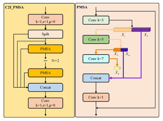 Figure 4 shows the module structure diagram of CSP_PMSA and PMSA. Suppose the input feature map is X R C × H × W , where C is the number of channels, H is the height of the input tensor and W is the width of the input tensor. Firstly, after the grouped convolution of k = 3 , g = C , X 1 and X 2 in the Figure 4 are obtained, where X 1 inputs the grouped convolution of k = 5 , g = C 2 , obtains the feature maps X 3 and X 4 , inputs the grouped convolution of k = 7 , g = C 4 and obtains X 5 . Then, X 2 , X 4 and X 5 are spliced along the channel dimension, and feature fusion is carried out through the convolution layer of k = 1 , and then, the output feature is obtained by adding with the input feature map.