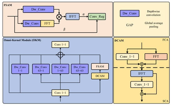 Suppose the input feature is X R C × H × W . After the convolution processing of k = 1 , the feature is input into three branches, namely, the local branch, large-scale branch and global branch. Then, the results of the three branches are fused by addition, and the feature fusion is performed by another convolution with k = 1 . In the large-scale branch, depthwise separable convolutions with kernel sizes of 63 × 63, 63 × 1 and 1 × 63 are used to obtain contextual features. The global branch consists of a dual-domain channel attention module (DCAM) and a frequency-based spatial attention module (FSAM). Given the input feature X G o b a l R C × H × W , the DCAM first applies frequency channel attention (FCA) to X G o b a l :