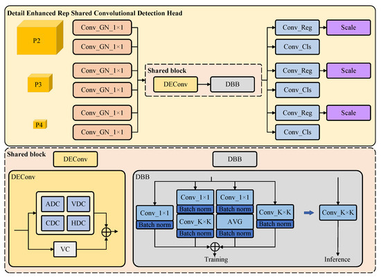 In order to improve the accuracy of UAV small target detection, the traditional approach is to add a P2 detection layer to improve the detection ability of small targets, but at the same time, it will also bring a series of problems, such as excessive calculation after adding the P2 detection layer, and longer post-processing time. Compared with only adding the P2 detection layer, this paper removes the P5 detection head, and uses the idea of shared convolution to design the Detail Enhanced Rep Shared Convolutional Detection Head (DERS). Its structure is shown in Figure 6. In In order to reduce the impact of shared convolution adopted to achieve light weight, DERS uses reparameterized convolution Diverse Branch Block [20] (DBB) to introduce more learnable parameters to improve the detection accuracy of weak and small UAV. The reparameterized convolution can greatly improve the parameter utilization, which is the same as the ordinary convolution in the inference stage, so that the detection head can achieve fewer parameters and less calculation, improve the detail capture ability of the detection head and reduce the loss of accuracy. At the same time, DEConv [21] is introduced, so that the network can extract the detailed features of small targets more effectively. In order to cope with the problem of inconsistent object scales detected by each detection head, the scale layer is used to scale the features.