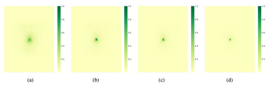 From Figure 8, we can intuitively see that compared with Figure 8a, the center region of the receptive field in Figure 8b is darker; compared with Figure 8c, the center region in Figure 8d is darker, and the effective receptive field is more focused on the center region, which proves that the CSDE module in this paper can focus the effective receptive field on the center region of the anchor point. The more concentrated effective receptive field can capture the detailed features of small targets better, such as texture, shape, etc., which is more conducive to the expression of small target features. When detecting weak and small targets, the small receptive field can perceive pixel-level differences, which means that the network can perform finer-grained feature extraction on the image to locate the small targets more accurately, and thus reduce the phenomena of false detection (misjudging the background or non-target area as a target) and missed detection (failing to detect the small targets that are actually present) due to the large receptive field. Based on the above experiments, this paper concludes that CSDE is most effective when applied to B1 and B2 layers.