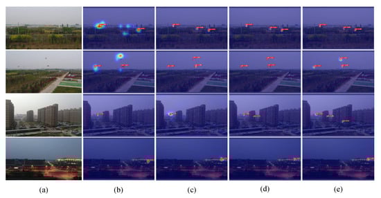 In Figure 9, we compare the proposed model with the YOLOv8n baseline model, and the selected comparison scenes include the scene where the UAV is a small target, the scene with complex background and the scene with low light. Figure 9b represents the original YOLOv8 algorithm, which has the problems of identifying the background as a target, focusing on a large area, containing too much background and failing to detect all the existing targets. The original YOLOv8 algorithm is easily disturbed by similar objects around it, its feature expression ability is not strong and its ability to detect small targets is poor. In the first row of Figure 9b, the YOLOv8 algorithm incorrectly identifies backgrounds such as tree branches as drones, and the CSDE module solves this problem. This is because the EMA attention mechanism in the CSDE module enhances the robustness of the model to illumination changes and complex background interference, which illustrates the superiority of our model in identifying small targets and complex environments. The third row of Figure 9 shows the reduction in the missed detection rate, which is attributed to the small object detection layer as well as the CSDE module, which effectively preserves the small object detail features. As can be seen in Figure 9d, CSP_PMSA and the Omni-Kernel Module enhance the modeling ability of the model for the context, which is reflected in the modeling of the position relationship between the fuselage and the arm as well as the position relationship between the UAV and the background, effectively improving the positioning ability of the model for the UAV. Figure 9e shows the ATA-YOLOv8 algorithm proposed in this paper. The dark area is concentrated in the fuselage and arm part of the UAV, covering almost the entire UAV, which effectively enhances the target feature extraction, improving the detection performance.
