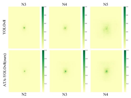 To reflect the enhancement of the effective receptive field by ATA-YOLOv8, this paper visualizes the effective receptive fields inputted to the detection head. The first row in Figure 10 is the effective receptive field visualization plot of the original YOLOv8, and the darker areas in the plot correspond to the effective receptive field sizes of the feature maps when the downsampling multiplicity is 8, 16 and 32, respectively. The second row is the effective receptive field visualization of ATA-YOLOv8, which corresponds to the effective receptive field size of the feature maps when the downsampling multiplicity is 4, 8 and 16, respectively. The design of adding the N2 layer is more favorable to the small target detection task, and the smaller effective receptive field is more focused on the detection of small objects. At the same scale, such as with the N3 and N4 layers of the two models, the effective receptive field map of ATA-YOLOv8 is obviously more focused on the center region than that of YOLOv8n. In the UAV detection task, the features of ATA-YOLOv8 are crucial for distinguishing the UAV from the background. Focusing the receptive field on the center can extract these key features more prominently, enhance the discriminative ability of the features and improve the accuracy of the detection.