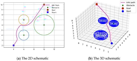 APF is a commonly used path planning algorithm, which is mainly used for UAV path planning and obstacle avoidance, and the specific effect is shown in Figure 3. Its core concept lies in constructing a spatial potential field model in which any position is subject to the action of the potential field. The negative gradient direction of the potential field indicates the movement orientation in path planning, i.e., the path extends along the direction of the decreasing value of the potential function. The essence of the path planning problem lies in finding a path from a start point to a goal point while satisfying all the predefined conditions. In the artificial potential field method, the goal point is set as the center of the gravitational field, and in an obstacle-free environment, the path gravitationally converges to the goal point. On the contrary, obstacles in the environment are considered the center of the repulsive field, which serves to ensure that the planned path avoids collision with the obstacles.