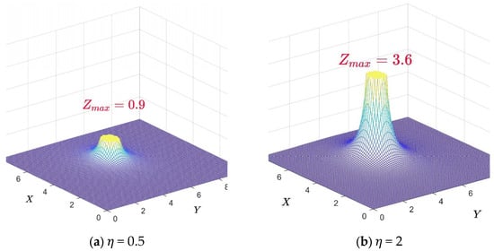 In this algorithm, there exists a gravitational gain coefficient, , and the specific coordinates of the target point . According to the gravitational field model, when the Euclidean distance of a point P from the target point in space increases, the gravitational force on the point increases accordingly. The specific shape of the gravitational field model is illustrated in Figure 4 [23], where the gravitational point is located at (5, 5), and it can be observed that the shape of the gravitational field bends as the gravitational coefficient increases. Guided by the gravitational field, any point in space moves in the direction that minimizes the potential energy function, which points exactly to the position of the target point, and the gravitational force at the end of the trajectory is as follows: