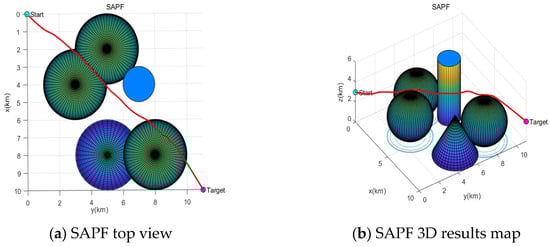 Figure 14 shows the comparison between the SAPF and RRT algorithms, and it can be seen that the RRT algorithm has a “long way” result. When the UAV is involved in an emergency operation, this “long distance” result is not allowed, and the path of the RRT algorithm is close to the obstacles, which makes the UAV very prone to collisions with the obstacles under the influence of external factors (e.g., wind, rain, etc.). The SAPF algorithm, on the other hand, can reach the target point faster by virtue of its superiority, and the result is clearly better than the RRT algorithm.