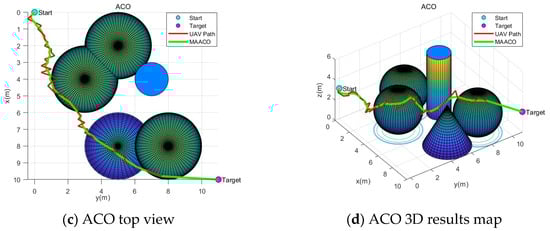 Figure 13 shows the comparison results between the SAPF and ACO algorithm; it can be seen that the path of the ACO algorithm is more complex, even though the length of the path is still larger than the SAPF algorithm after the smoothing operation. It proves that the UAV can reach the target point over a shorter time span, which proves the superiority of the SAPF algorithm.