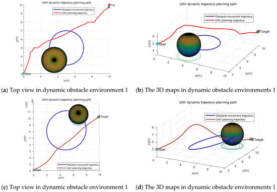 In order to further validate the effectiveness of the SAPF algorithm in dynamic obstacle environments, this study applied it to the trajectory planning task of a UAV. Figure 17 demonstrates the dynamic obstacle simulation environment used to train the UAV, where the blue curve represents the motion trajectory of the dynamic obstacle and the red curve represents the flight trajectory of the UAV under the planning of the SAPF algorithm. Figure 18 further shows the operation results of the SAPF algorithm in dynamic obstacle environments with different complexities. The experiments show that the SAPF algorithm exhibits excellent performance in multiple scenarios, not only planning a reasonable trajectory in real time but also ensuring the continuity and smoothness of the UAV flight path. In addition, the algorithm is outstanding in terms of the collision avoidance effect, which can effectively deal with the random motion of dynamic obstacles and avoid the local minima problem and oscillation phenomenon commonly found in the traditional APF method.