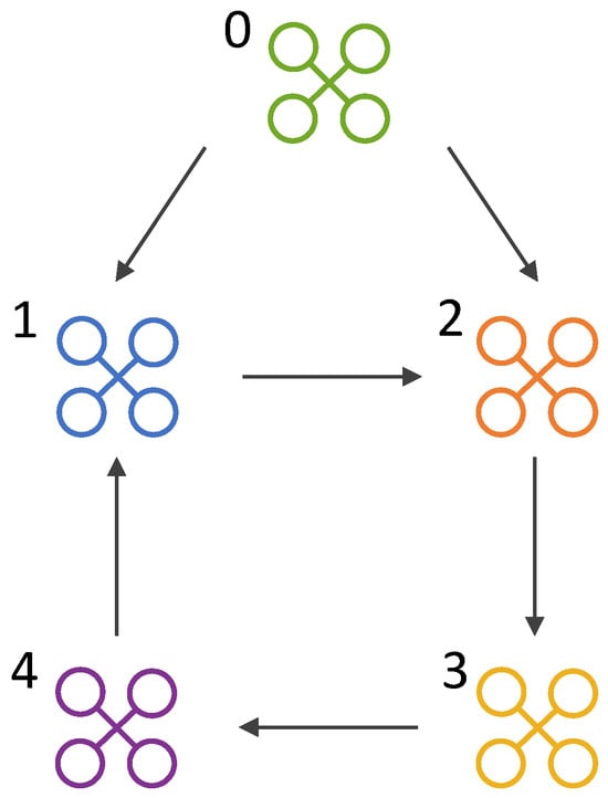 where and are the states of follower i and the leader, respectively, and is the control input of follower i. and are the state constant matrix and the input constant matrix, respectively. To facilitate the reduction of a general linear system to a second-order system, thereby providing position and velocity information in the context of multi-UAV flight control, matrices A and B as defined in the system of Equations (3) and (4) of each UAV are given by