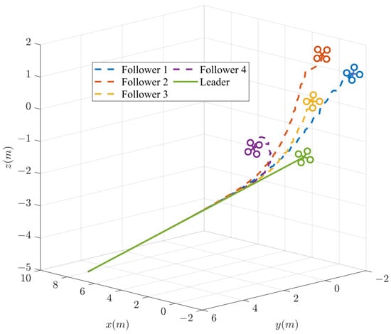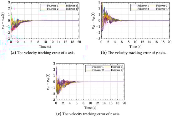 The trajectories of the multi-UAV system are shown in Figure 2. Within the 3-D plane, the leader is indicated in green, while the four followers are marked blue, orange, yellow and purple, respectively. It is observable that, at the initial moment, the positions of the UAVs are dispersed. However, under the distributed controller (9) and DET mechanism (12), all followers achieve consensus with the leader’s position within a finite time. Figure 3 illustrates the velocity tracking error among the UAVs, demonstrating that the velocity tracking error converges to zero within a finite-time. Figure 4 contrasts the scenario without ET, revealing that the DET approach reduces the triggering frequency of the followers by , , , and , respectively. This indicates that the DET approach markedly decreases the frequency of information transmission and control updates.