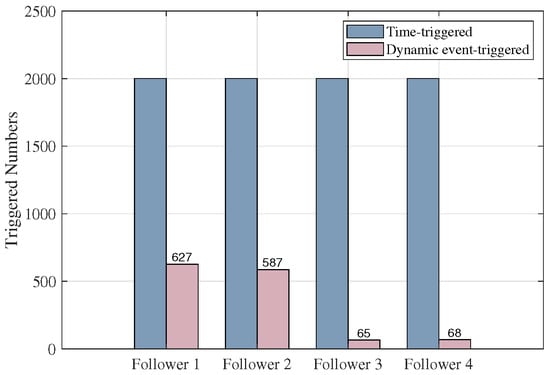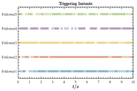 In order to further demonstrate the design flexibility of the DET mechanism proposed in this paper, i.e., the convergence speed and triggering frequency can be modified by adjusting the parameters of the triggering function, we select and keep other parameters the same to conduct the simulation test. Figure 10 and Figure 11 present the simulation results. Similar to the results of , all followers achieve consensus with the leader within a finite time, and tracking errors converge to zero. Furthermore, as the increases, there is a rise in the number of event triggers and a faster convergence of the tracking error. This approach contrasts with traditional asymptotic consensus strategies, which rely on continuous or event-based communication and may lack efficiency. The consensus strategy proposed in this work is specifically designed to achieve leader-following consensus within a finite time, while simultaneously reducing energy consumption and communication overhead. Compared to existing FTDET strategies, the proposed method significantly reduces communication overhead and enhances design flexibility, enabling the adjustment of both the system’s convergence speed and triggering frequency through parameter tuning.