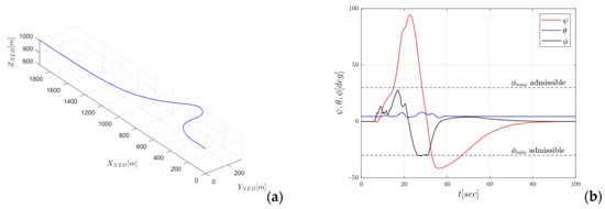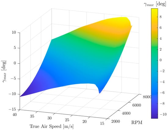 The exact value of for a given altitude is found by solving the maximization problem described by Equation (7) while enforcing the respect of trim equilibrium described by Equation (9). For instance, at an altitude of 9.57° corresponds to a true air speed of TAS = 18.8 and an engine setting of 7950 RPM. Considering a detection range of , this would result in , which is insufficient to ensure a minimum separation provision of as recommended in the guidelines. It should be noted that the actual minimum separation attainable with a climbing maneuver alone would be even smaller than the aforementioned estimate due to engine and aircraft dynamics, which prevent the onset of an immediate maximum flight path angle and unavoidable latencies between actual detection and evasive command implementation.