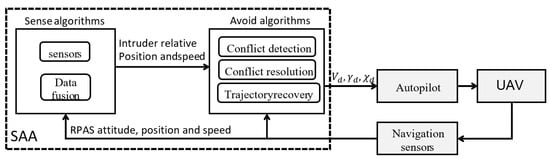 The typical integration of an SAA system within the closed-loop control system of a UAV is shown in Figure 5. As can be noted, the underlying algorithms take as inputs the UAV position and velocity states provided by the inertial navigation system (INS) and the velocity and position states of the intruder aircraft and yield as outputs; in the most general case, the demanded speed, flight path angle, and ground track angle are in turn fed as input to the autopilot system to avoid the collision threat. Specifically, the sense algorithms recognize possible intruders by means of data fusion between the SAA sensors and the inertial navigation system sensors, which allow for the reconstruction of the position and velocity states of such intruder aircraft in an inertial reference system. Then, the avoid algorithms check if there will be intersections in the future between the planned UAV trajectory and a safety bubble associated with the detected intruder aircraft. If a conflict is foreseen to occur, the SAA system feeds as input to the flight control system autopilot new setpoints of demanded flight speed, flight path, and ground track angles to carry out an effective evasive maneuver.