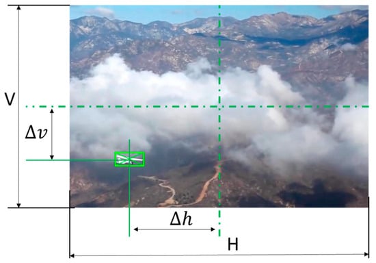 A Ransac approach is used to derive the homography matrix describing the transformation between the current frame and background model, starting from point correspondences between the two scenes. The background model is then warped according to this transformation so as to co-register it to the current frame and minimize the noise due to camera egomotion. Connected component analysis (CAA) is then used to group various blobs in the binary mask into a single object of interest. Statistical criteria are then applied to validate only those tracks that exhibit a certain regularity in terms of position within the field of view and dimensions across the various frames; more details on the specific algorithms involved are provided in the subsequent sections. A validated track is then followed across various frames, leveraging an implementation of the Kanade–Lucas–Tomasi (KLT) feature tracker [33]. From the knowledge of camera parameters (focal length, resolution, and sensor size), the centroid position of the bounding box, centered around the intruder aircraft (depicted as a green rectangle in Figure 7), in terms of pixels within the scene is then transformed into elevation and azimuth anglesby means of Equation (11). Here, are the azimuth and elevation angles, respectively, in a reference system fixed with the camera; are the sensor width and height, respectively; are the vertical and horizontal resolutions of the scene; is the focal length; and are the vertical and horizontal positions of the intruder aircraft within the scene, expressed in pixels (see Figure 7).