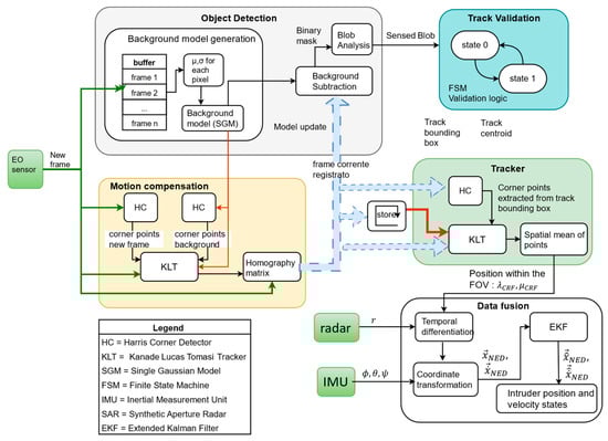 For this specific application, the only output of the SAA system is the demanded ground track angle used as a setpoint for the coordinated turn on the horizontal plane. For the actual implementation of the system, a multisensory architecture leveraging data fusion between radar and the EO sensor has been chosen. As it has been shown in several previous works [22,30,32], this allows us to compensate for the shortcomings of each sensor type, reduce noise, and increase the overall solution accuracy. In particular, data fusion between radar and EO sensors leads to an increase in system robustness with respect to false alarms and missed detections during the object detection stage, coupled with a higher accuracy in the tracking stage. A diagram portraying the high-level schematics of the developed architecture is shown in Figure 6. The working principle of the system can be summarized as follows: both the EO (camera) sensor and the radar scan the environment ahead of the UAV in search of a potential threat. Each new frame captured by the camera is compared against a background model of the scene, leveraging an object detection strategy based on a single Gaussian model (SGM), where suitable motion compensation algorithms are employed to compensate for the egomotion of the camera.