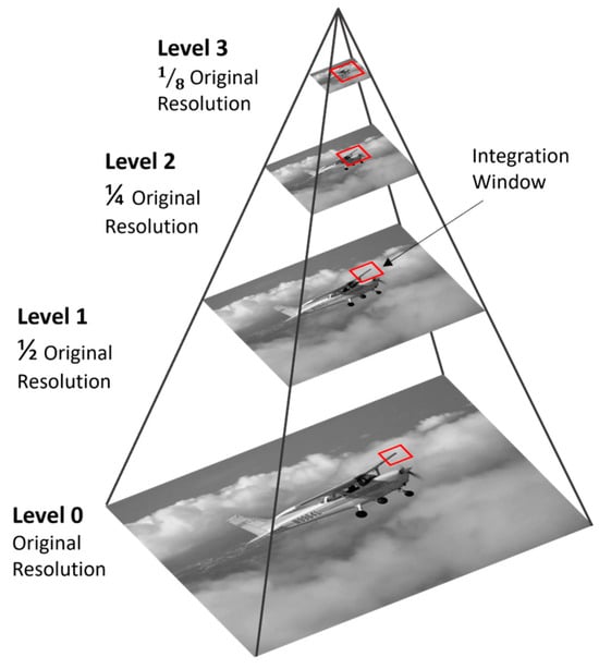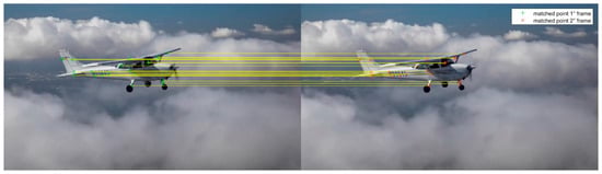 Vision trackers based on deep learning such as YOLO [34] have been discarded because they generally do not perform well when the object to be tracked is very small. Within the standard computer vision literature, we selected some classes of potential candidates, namely the minimum output sum of squared error (MOSSE) [35], the Kanade–Lucas–Tomasi feature tracker [36], the Kernelized Correlation Filter (KCF) [37], Continuously Adaptive Mean Shift (CamShift) [38], and feature-based methods, i.e., Oriented FAST and Rotated BRIEF. The MOSSE algorithm is a correlation filter-based tracker that learns a filter (template) for the target object by minimizing the sum of squared differences between the convolution output and a desired Gaussian response. Despite being extremely fast due to efficient Fourier domain operations and thus suitable for embedded platforms, it was discarded because in the trials, it exhibited a certain drift due to the continuous online adaptation, probably ascribable to background interference. The KFC addresses this problem by using nonlinear kernel methods to allow for richer feature representation and improved modeling of appearance changes. This leads to better discrimination between target and background, increasing tracking accuracy over basic MOSSE. However, this comes at a cost because the algorithm requires more computation resources than the MOSSE (we tried it with HOG features) and the base version usually does not directly handle scale or rotation changes, which in our case occurs when the maneuver takes place. Despite ORB-based trackers being very robust under changes in brightness, scale, and rotation on paper, we realized that for this application, due to the textureless appearance of the intruder aircraft at a distance, the tracker performed poorly with a lot of drift accumulating during the tracking. The KLT algorithm proved to be extremely efficient, moderately robust to noise when coupling it with robust corner points and to small illumination changes due to the use of image gradients. Despite it assuming a small displacement between frames (expected displacement must be below half the size of the integration window), the pyramidal implementation described in [36] allows us to track large motion while preserving computational efficiency. Therefore, our choice fell on the Kanade–Lucas–Tomasi feature tracker.