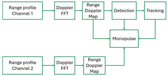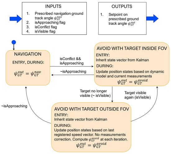 The knowledge of the target distance provided by the radar allows us to close the tracking problem. Specifically, distance measures, elevation, and azimuth angles together with the UAV position, velocity, and attitude states are fed as input to an extended Kalman filter (EKF), which carries out data fusion and outputs intruder aircraft velocity and position states. These states are then fed as input to collision avoidance routines, which compute an evasive maneuver when an impending collision is predicted. A new setpoint on the ground track angle is computed at every iteration step in a such a way that the trajectory of the UAV will be tangential to a sphere centered around the intruder aircraft at the point of closest approach. More details about the designed algorithms are provided in Section 4.