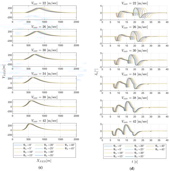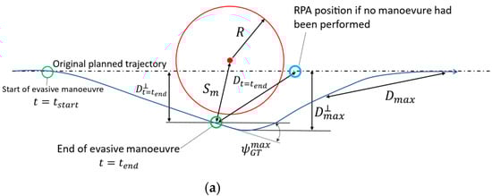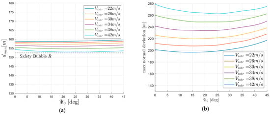 - Detection range, . It is connected to the time to collision by means of approaching speed. It must be sufficiently large to allow for an avoidance maneuver complying with aircraft dynamic, structural, and aerodynamical constraints that guarantee a minimum separation of 500 ft at the closest point of approach to the obstacle (“miss distance”) [26]. For the characterization of this requirement, the procedure described in [30] has been adopted by considering the most critical condition of a frontal encounter. Since the evasive maneuver will be conducted by means of a corrected turn on the horizontal plane, essentially depends on four factors, namely UAV speed, ; intruder aircraft speed, ; latency between detection and evasive command execution, ; and especially the minimum turn radius, . With reference to Figure 2, the minimum required detection range can be expressed aswhere represents the distance between the UAV and intruder at the beginning of the evasive maneuver. With very good approximation, the minimum distance between the two aircrafts is obtained when the UAV has reached a turn angle given by: