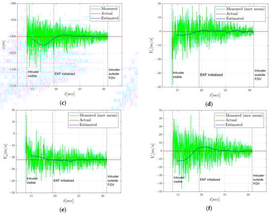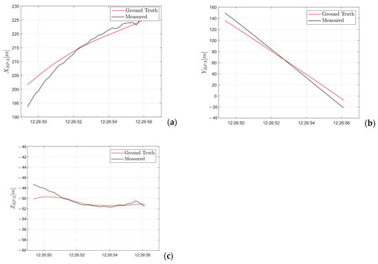Telemetry data were post-processed and transformed into a Cartesian-fixed baseline reference frame (BRF) with its origin centered in the SAA system position and the x axis pointing north, axis towards right, and chosen so as to comply with the right-hand rule. The position of the UAV was reconstructed by the system in a Cartesian reference frame fixed with the SAA system, with the axis oriented along the LOS. Attitude angles of the system as recorded by the IMU installed on the radar were used to transform the position state recorded by the system in the BRF to compare them with telemetry. Figure 29 shows one example of such a reconstruction of the target position states, expressed in the BRF. Due to the presence of ground clutter in certain sections of the flights, radar distance was not available, but optical algorithms still correctly performed detection and tracking. In the absence of distance readings, it was still possible to reconstruct heading and azimuth angles in the camera reference frame. Figure 30 shows the comparison of said angles with ground truth (obtained by projecting the real UAV position logged by telemetry into the focus plane by means of camera intrinsic and extrinsic matrices) for two distinct segments of flight. The figures show a good correspondence between the intruder position states reconstructed by the system and those measured by the telemetry onboard. Actually, the SAA system was equipped with the same high-performance IMU platform embarked onboard the UAV (spatial model produced by Advanced Navigation). Slight differences between recorded and reconstructed states can be explained as follows: The pitch and roll angles of the system were recorded accurately by the IMU platform, while the heading of the radar beam and camera optical center was affected by a slight error due to the fact the magnetometer was either poorly calibrated or affected by the magnetic field generated by the radar. This slight error can clearly be noted in Figure 29a,b; in that segment of flight, the UAV was crossing the FOV from right to left (as shown by the negative slope of in Figure 29b) while slightly moving away from the SAA system (shown by the positive slope of in Figure 29a). The specific trends in the reconstructed UAV y state (), which is higher than ground truth while the target is in the right portion of the FOV and lower than ground truth when the target occupies the left-most portion of the FOV, coupled by an opposite trend on the position state, clearly suggest a slight discrepancy in the IMU heading measurement of the system, whose actual heading was apparently slightly rotated clockwise (seen from above) with respect to the IMU measurement. The exact same effect can be appreciated in Figure 30a–c, where the reconstructed azimuth angle appears slightly rotated with respect to ground truth. The fact that the trend is opposite in the two pictures is explained because in Figure 30a, the UAV was crossing the system’s FOV from right to left, while in Figure 30b, the UAV was moving in the opposite direction. The slight errors observable in the z position state in Figure 29c and in the reconstructed elevation angles of Figure 30b–d when the target occupies the lateral region of the system’s FOV are instead caused by slight distortions in the images introduced by the grand angular optics, which were not fully compensated during the tests. Overall, the system provided great results, with relative errors for the target position states lower than .