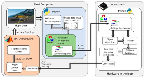 - Refresh rates: For a precise tracking of the intruder aircraft, computer vision algorithms should run at a sufficiently high frequency, at > 10 frames per second (FPS). Given the limited computational power available onboard, it is thus essential to optimize object detection and tracking algorithms and to select the best compromise between image resolution and performance. Data fusion algorithms are based on a standard implementation of an extended Kalman filter and, thanks to optimized linear algebra libraries, do not pose a significant computation burden on the vision processing unit (VPU) processor. Likewise, collision avoidance routines that exploit simple geometric laws do not constitute a bottleneck for performance; the computation of the setpoint on the desired ground track angle to carry out the maneuver essentially boils down to the extraction of the roots of a fourth-order polynomial, which again is performed effectively on the VPU processor by means of optimized linear algebra libraries (OpenBLAS/cuBLAS). The bottleneck is thus represented by the object detector pipeline.
