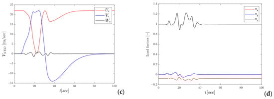 Results of a HIL collision scenario in the complete simulation environment. Intruder approaching from starboard side. ; Three-dimensional trajectory (a), Euler angles (b), speed components in NED reference frame (c), load factors (d).