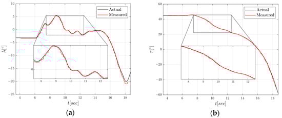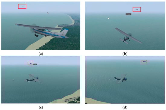 All the simulations conducted have shown full compliance with the aero mechanical constraints of the aircraft while at the same time respecting the safety boundaries; the minimum separation distance is never violated for every initial position of the intruder aircraft according to the scheme of Figure 17b and for a range of the intruder’s flight speed equal to , greatly exceeding the cruise speed of other UAVs belonging to the same class as imposed by system requirements. Figure 23 illustrates some results in terms of UAV flight parameters throughout the evasive maneuver, obtained with the HIL complete simulation framework, for a conflict scenario with intruder aircraft approaching from the starboard side and flying at a constant speed of . For the same simulation, Figure 24 shows the comparison between the actual elevation and azimuth as they would appear on the sensors based on the ground truth position of the intruder aircraft and the ones reconstructed by the SAA system, compensated for the transmission and processing delay of the signal between the VPU and host PC. Figure 25 shows some screenshots from the Flight Gear rendering relative to the same collision scenario with the intruder aircraft approaching from the starboard side, highlighted with a red bounding box. Both the intruder aircraft and the UAV were rendered with a Cessna 172p mockup. Notice, however, that the simulations were conducted with the viewpoint shown in Figure 22, with the camera pointing forward so that the UAV actual rendering was meaningless; in Figure 25, UAV rendering has been included for the sake of clarity in showing the evolution of the evasive maneuver on the horizontal plane.