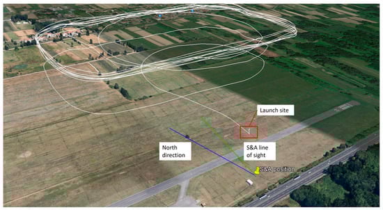 Figure 28 shows the position of the sense-and-avoid system during the flight test with respect to the trajectory of the UAV. The blue line indicates the direction of the geographic north, the green line is parallel to the SAA LOS, and the launch site of the drone is marked with a red rectangle. The drone was launched in the air, leveraging its pneumatic catapult platform. It was decided to position the radar with the highway behind (visible in the lower right corner of the image) in order to reduce the ground clutter as much as possible. The radar sensor was designed for operation in the air where ground targets are not so close; thus, during the flight test, some adjustments to the gains were made in order to compensate for the presence of cars and other highly reflective objects nearby. As noticeable in Figure 28, after take-off, the UAV entered a helicoidal climbing trajectory and then it remained in a Loiter circuit (approximately rectangular in shape) at a constant altitude of .