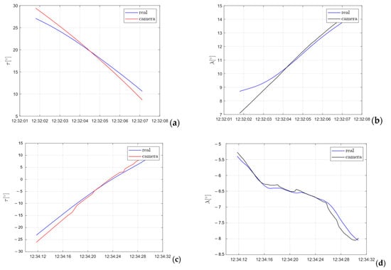 Relative azimuth (a,c) and elevation (b,d) angles between target UAV and SAA reference frame for two different flight phases.