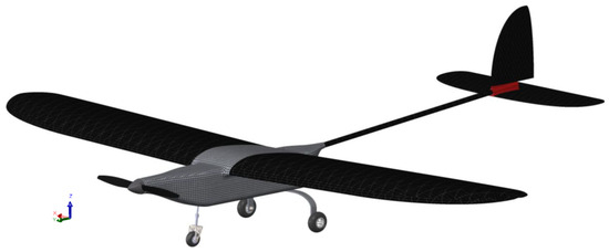 The object of the analysis is the wing of a UAV (Figure 1) designed for the SAE Aero Design 2022 competition, which fully complies with the competition’s regulatory requirements [17]. The aircraft is 2.47 m long, with a wingspan of 3.05 m and an empty weight of 4.5 kg. The wing’s aspect ratio is 6.6. The wing was fabricated using a hand lay-up process combined with vacuum-bagging technology. The hand lay-up and vacuum-bagging processes are sufficiently repeatable for this application due to its simplicity and established methodology. Although minor variations may occur due to manual handling, the process consistently achieves the required material properties and structural performance.