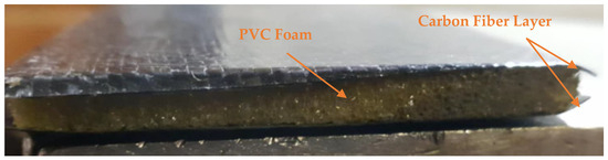The wing shell is made of two layers of carbon fiber fabric, specifically Aspro spread tow carbon fabric A-80 in an epoxy resin matrix, oriented at ±45° with respect to the chord of the wing, with a 1.2 mm sheet of foamed PVC sandwiched between them (Figure 2). Both the upper and lower skins of the shell were fabricated in this manner. The shell’s upper and lower skins were both manufactured using this sequence.