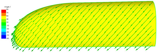 The fiber orientation of the upper skin of the wing was set at 45° relative to the X-axis and continued seamlessly onto the lower skin of the wing. This wrapping of the fiber from the upper to the lower skin ensured the continuity of the composite structure. However, due to the chosen coordinate system, to correctly represent this continuity in the simulation, the fiber angle for the lower skin was specified as 315° with respect to the X-axis. This adjustment accurately represented the continuous fiber orientation across both skins, as intended in the structure.