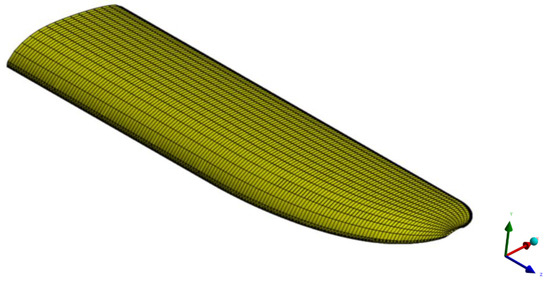 To ensure a detailed and realistic representation, the finite element model included all internal structural components illustrated in Figure 3, guaranteeing that the simulation reflected the actual configuration of the wing. The aileron was modeled as an integral part of the wing in the model. Determining the natural frequencies of vibration and conducting aeroelastic analyses of control surfaces are distinct topics in aviation, studied in dedicated research due to the complexity of the problem and the distinct behavior of these surfaces compared to the rest of the aircraft wing. Mesh sizes were meticulously selected to balance precision and computational efficiency, with detailed meshing for critical components such as bolts, ribs, and stringers. A mesh size of 10 mm was used for the wing shell, employing the Shell 181 element type presented in Figure 7. Volumetric elements were meshed using a hexahedral mesh: 2.5 mm for ribs and stringers, 1 mm for bolts, and 5 mm for the spar. The simulation model assumed the structure to be continuous, regular, and smooth.