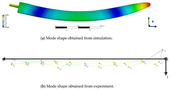 The differences between the experimental and simulation results are not negligible, ranging from 2.71% to 9.26%. This can be attributed to the simplifications made in the simulation model, which assumed continuity and homogeneity of the structure. However, a significant correlation in the mode shapes was observed as presented in Figure 8, resulting in a satisfactory representation of the dynamic behavior. Further work will focus on refining the model to reduce these discrepancies.