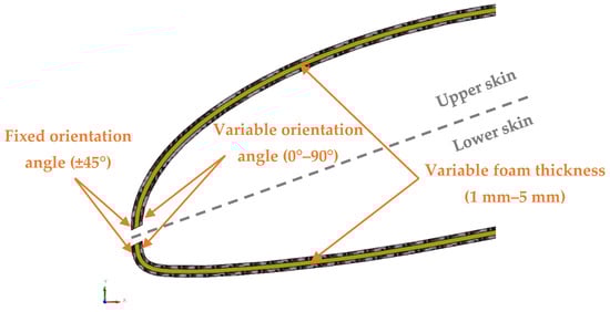 The wing structure consists of two skins, each manufactured from a sequence of materials: carbon fiber oriented at ±45°, a PVC foam, and another carbon fiber layer at ±45°. A critical assumption is that the outer layers, oriented at ±45°, will remain unchanged. This ensures the structure’s ability to effectively carry torsional stresses, as the ±45° orientation is optimal for handling shear loads caused by torsion [34]. The placement of these layers farther from the torsion axis maximizes their contribution to torsional stiffness, which is a key functional requirement of the shell. Keeping this configuration unchanged preserves the integrity of the torsion-resisting mechanism of the wing.