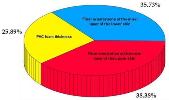 The foam thickness influences the bending stiffness by changing the geometry of the cross-section of the wing structure. This effect reduces the sensitivity of the natural frequency to foam thickness compared to fiber orientation, which directly influences the wing’s in-plane stiffness and bending stiffness. However, as the thickness of the foam increases, the inner carbon layers at 0–90° move closer to the neutral axis, which can slightly reduce the flexural stiffness of the wing. Despite this, the core material plays a role in maintaining the structural integrity and ensuring the outer layers are effectively supported, preserving the wing’s strength and shape. The sensitivity analysis demonstrated that the first natural frequency of the wing shell is most strongly influenced by the fiber orientations, with the upper part’s fiber orientation contributing 38.38% and the lower part’s fiber orientation contributing 35.73%. The foam thickness accounts for 25.89% of the variation, indicating a secondary but still notable effect.