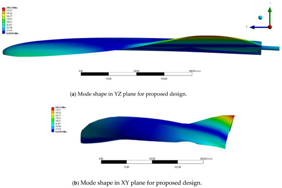In this case, the optimal configuration was achieved with the upper layer fiber oriented at 90°, the lower layer fiber oriented at 0°, and a PVC foam thickness of 1.05 mm. Under these parameters, the mass of the wing shell was minimized to 412 g, while the first natural frequency was maximized at 122.95 Hz. The mode shape of the proposed design is shown in Figure 12.