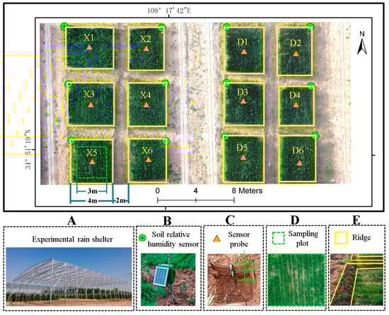 Experimental field conditions. Rain shelter (A), soil relative humidity sensor (B), soil relative humidity sensor probe (C), sampling range (D), and field ridge (E) are shown.