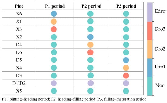 According to the Chinese agricultural industry standard “Technical Specifications for Field Investigation and Leveling of Winter Wheat Disasters−NY/T 2283-2012” [], different drought levels during various growth periods were classified based on soil relative humidity content (Table 1). Soil relative humidity content is defined as the percentage of soil water content relative to the field capacity. Due to the varying impacts of drought on yield at different growth periods of crops, this paper sets different drought levels for the three main growth periods of winter wheat. For the P1, P2, and P3 periods of winter wheat, light drought (Dro1), moderate drought (Dro2), and severe drought (Dro3) levels were established. Additionally, no drought (Nor) and extreme drought (EDro) were set for the entire growing period. The classification of drought levels for the plots is shown in Figure 2.
