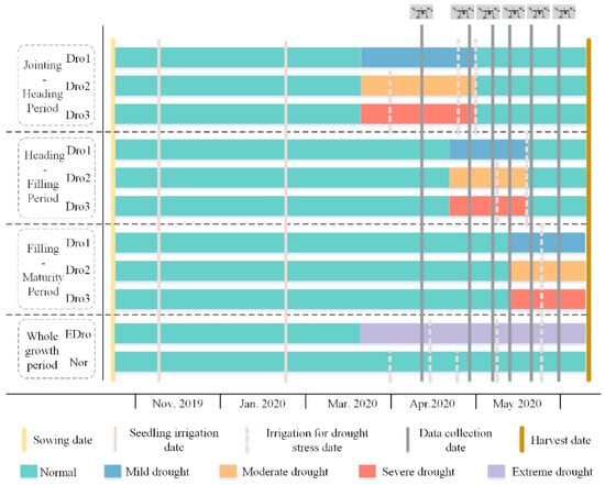 Timeline for the experiment. The light yellow solid line is the sowing date. The brown solid line is the harvest date, the French gray solid line (ensure seedling emergence and overwintering) and the French gray dotted line (ensure drought level) are the irrigation date. The dark gray solid line is the data collection date. The light green, blue, orange, red, and purple horizontal bars are the plots in the normal, mild drought, moderate drought, severe drought, and extreme drought conditions, respectively.