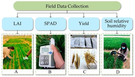 Field data collection, including LAI (A), SPAD (B), yield (C), and SRH data (D).