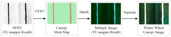 The NDVI-OTSU method (Figure 6) was used to separate canopy pixels from soil pixels for canopy image extraction. The main steps involve applying the OTSU method to the NDVI to determine the winter wheat canopy mask, followed by the matching of multispectral imagery, and finally separating winter wheat canopy pixels from soil pixels.