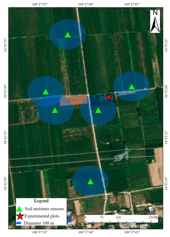 Six soil relative humidity sensors were installed within the field area near the experimental site. Eight hundred points were randomly selected within a 100 m radius around these six sensors to validate the accuracy of the drought threshold (Figure 7).