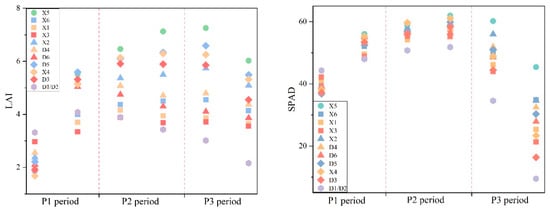 Figure 8 shows the ground truth measured LAI and SPAD values of winter wheat at different growth periods under various drought levels. Both LAI and SPAD generally exhibited a trend of increasing initially and then decreasing, reaching their peak values during the grain filling period. For the LAI, during the P1 period, the early phase of drought showed higher LAI values in plots X3 and D1/D2, while plots X5, X6, and X1 exhibited lower LAI values with no significant differences observed between them. In the later stage of P1, the LAI in plots X6, X1, X3, and D1/D2 showed a decreasing trend. This indicates that short-term drought initially promoted the increase in LAI, but as the duration of the drought extended, it had a significant inhibitory effect on LAI, which intensified with the increasing severity of the drought. After rewatering the plots, there were no significant changes in LAI. During the P2 and P3 periods, the LAI decreased with increasing drought severity. After rewatering, there were no notable changes in LAI across the plots. For the SPAD index, similar to LAI, during the early stage of the P1 period, a certain degree of drought facilitated an increase in the SPAD of winter wheat. However, in the later period of P1 and subsequently, drought suppressed the increase in SPAD, with the suppression intensifying as the severity of the drought increased.