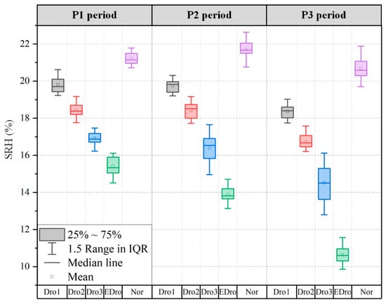 Figure 9 shows the SRH data. The SRH in each plot remained within the designed range at three growth periods, ensuring the intended drought levels for each plot.