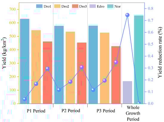 Figure 10 shows the results of winter wheat yield estimation and the reduction rate. During each growth period of winter wheat, varying degrees of prolonged drought caused a certain level of yield reduction. Additionally, at each growth period, the reduction rate increased with the severity of the drought. Throughout the entire growth period, the highest yield was observed in the X5 plot, reaching 979.39 kg/km2. The lowest yield was recorded in the D1/D2 plots, with a yield of 249.15 kg/km2, representing a reduction of 74.56%. During the P1 period, the X6, X1, and X3 plots experienced yield reductions of 3.73%, 16.63%, and 29.42%, respectively. During the P2 period, the X2, D4, and D6 plots experienced yield reductions of 11.64%, 18.38%, and 30.65%, respectively. During the P3 period, the D5, X4, and D3 plots experienced yield reductions of 11.54%, 19.40%, and 34.84%, respectively.